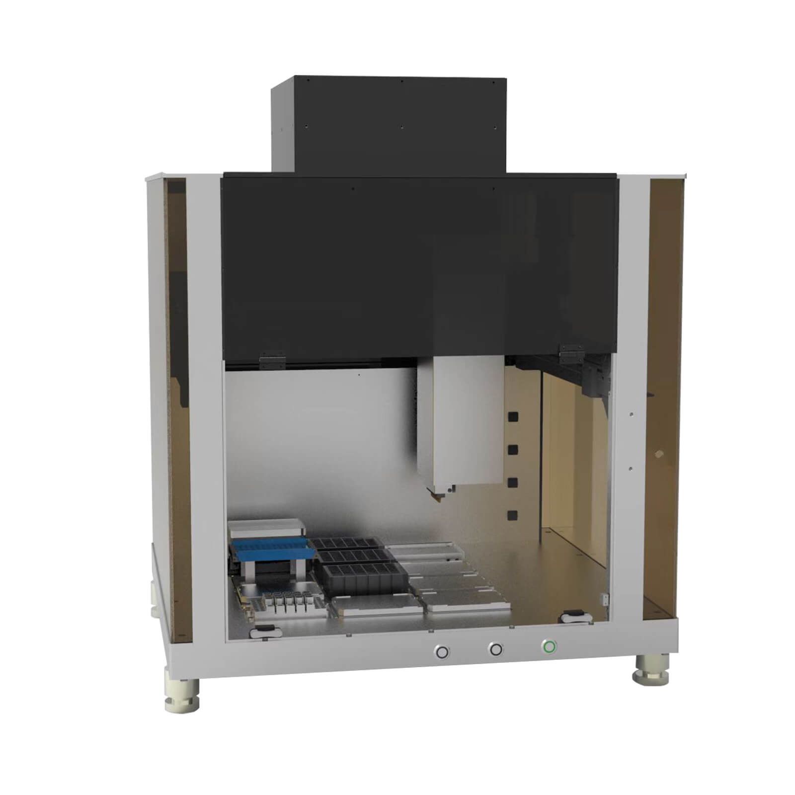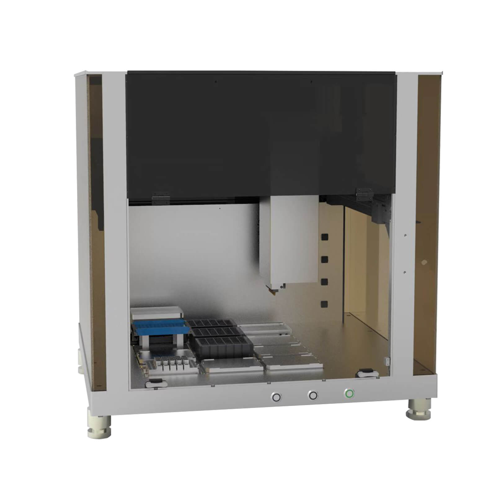 高精度移液机械臂,定位精度达±0.1 mm,智能感应机械臂状态,减少人为失误,保障样品安全,提高实验稳定性;配置8通道200 µL移液器,适用Tecan兼容自动化吸头,采用空气置换移液技术,1 μL移液CV≤5%。