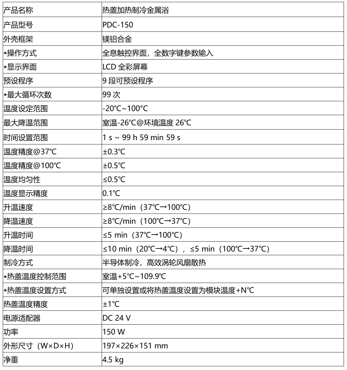 PDC-150热盖加热制冷金属浴是一款干式恒温器产品,最低温度可达-20℃,最高温度可达100℃。全数字键全息触控式,具有美观,易操作、加热制冷均匀等优点。采用微电脑控制,控温精度高,制样平行性好,采用热盖设计,可以有效防止样品冷凝,维持样品稳定,可设置可循环程序,可当作简易的PCR仪使用,可以代替传统的水浴装置,可广泛应用于样品的保存和反应、DNA扩增和电泳的预变性、血清凝固等。可用作细胞复苏仪。