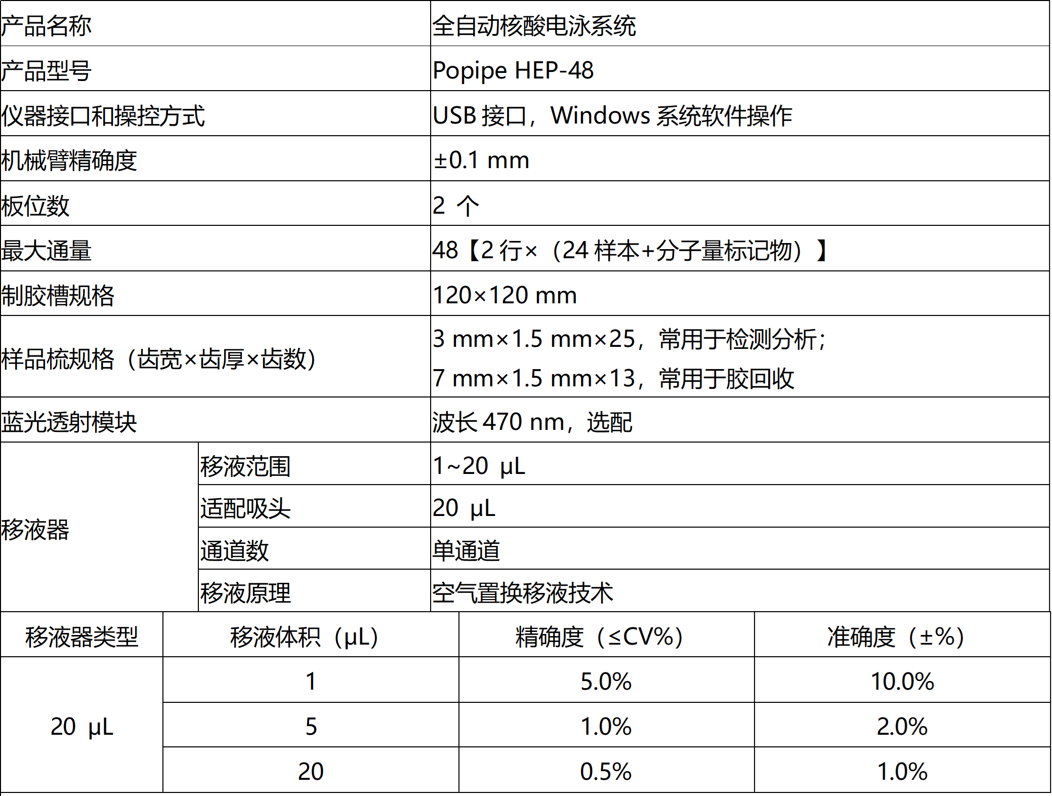 高精度移液机械臂,定位精度达±0.1 mm,智能感应机械臂状态,减少人为失误,保障样品安全,提高实验稳定性;配置20 µL移液器,采用空气置换移液技术,1 μL移液CV≤5%。