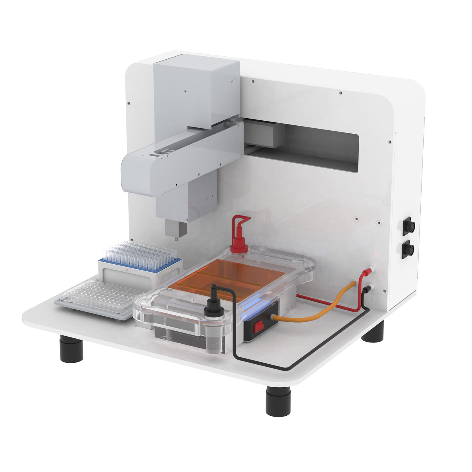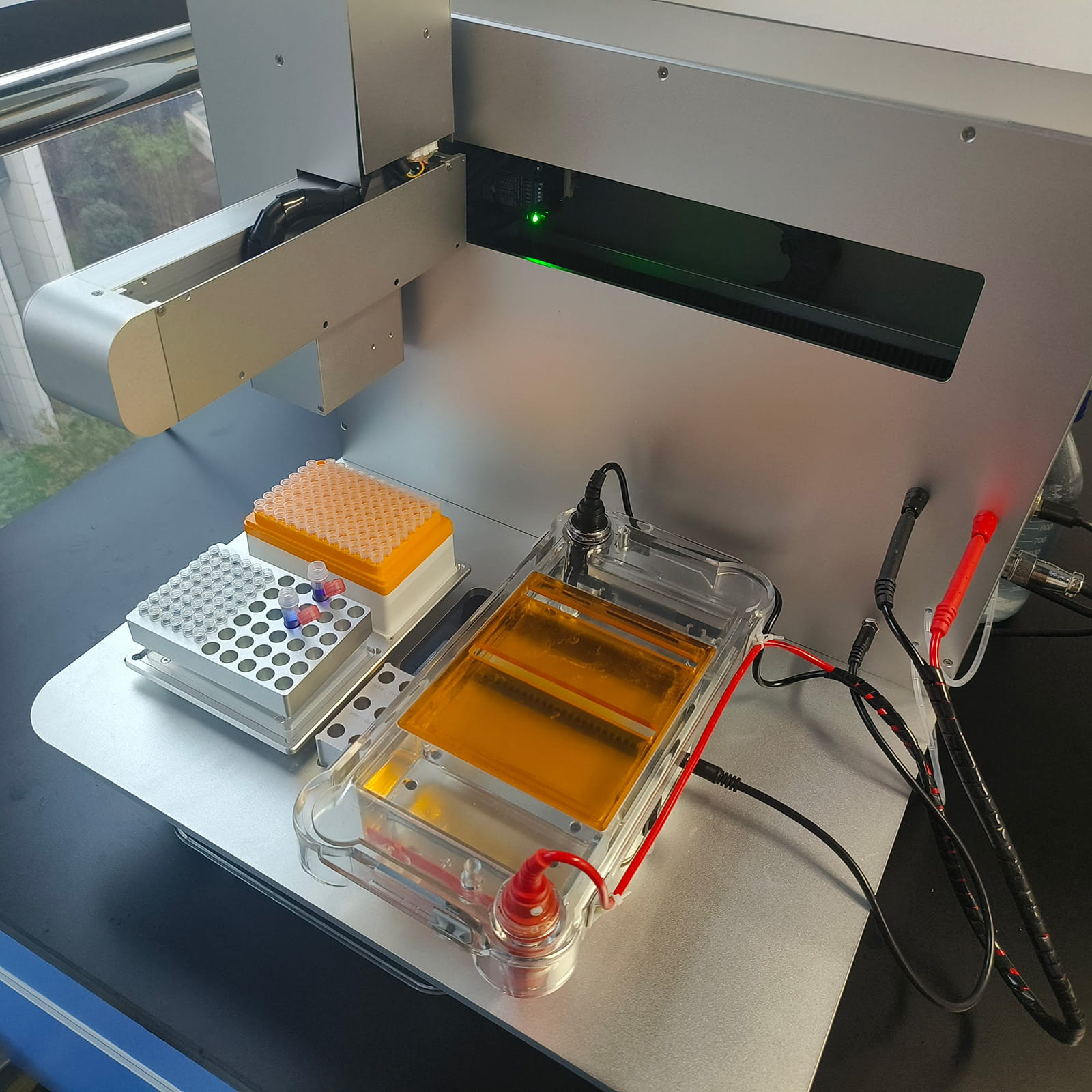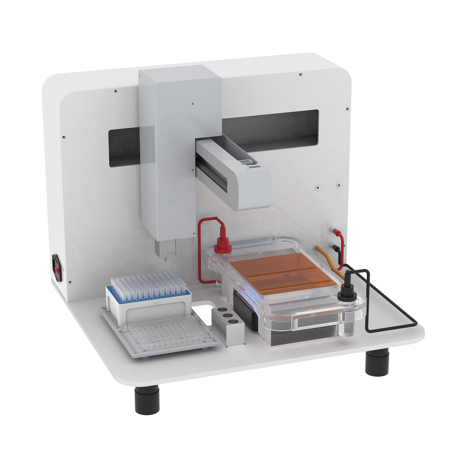 仪器提供2个标准板位,可用于放置吸头盒,和样本适配架,以放置0.2ml离心管、96孔PCR板等耗材。仪器提供一个水平电泳槽,以及制胶槽、样品板、样品梳等配件,用于制备小孔检测分析胶或者大孔切胶回收胶。仪器采用内置式电源,无需额外配置电源。